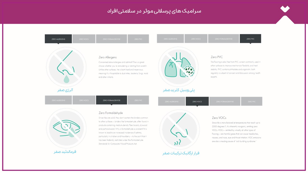 سرامیکهای پرسلانی دارای سطوح فشرده و غیر متخلخل و کاملا ضد آب هستند و سطحی نامناسب برای رشد کنهها، باکتریها، قارچها، کپکها و سایر مواد تحریککننده محسوب میشوند. سرامیکهای پرسلانی از بهداشتیترین مصالح ساختمانی، کاملاً عاری از رطوبت و غیرقابل پذیرش برای رشد انواع باکتریها هستند. به همین دلیل استفاده از آنها حتی در محیط هایی که نیاز به رعایت بهداشت بسیار بالایی دارند نیز توصیه میشود. همچنین سرامیکهای پرسلانی حاوی فرار ترکیبات آلی (VOC) نیستند که بطور بالقوه برای انسان و محیط زیست سمی هستند، زیرا پخت طولانی مدت در دمای بیش از 1200 درجه سانتیگراد هرگونه باقیمانده آلی را از محصول حذف میکند. سرامیکهای پرسلانی همچنین فاقد فرمالدئید، یکی از رایجترین عناصر آلاینده در فضای داخلی منازل و از جمله علل احتمالی مشکلات تنفسی هستند و کاملاً عاری از PVC، پلاستیک و مشتقات نفتی هستند.